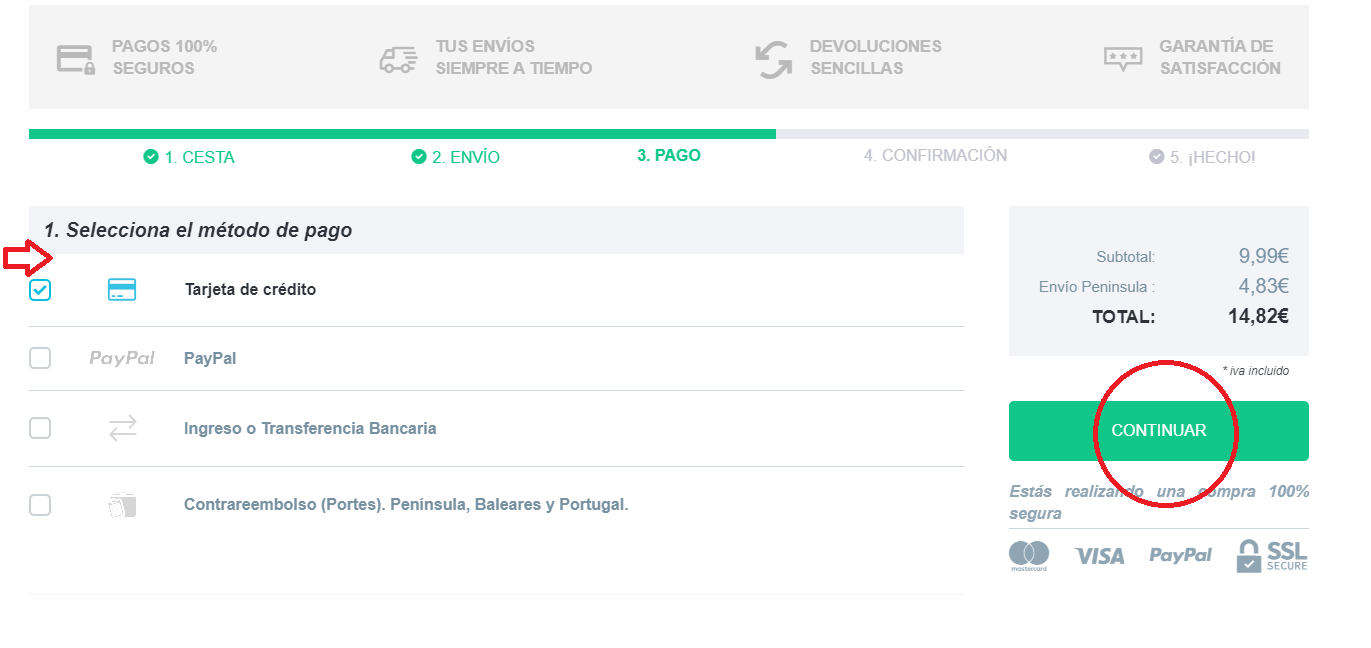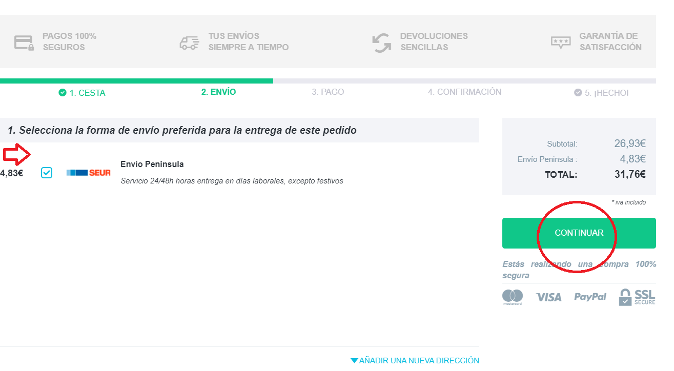 5 . Selecciona la forma de envío, por ejemplo " Envío Península"
