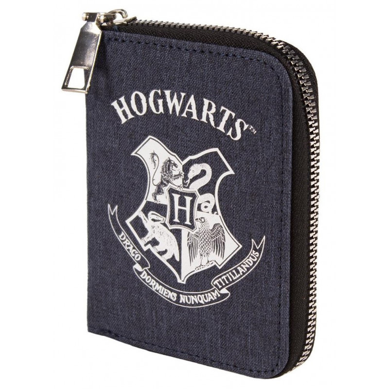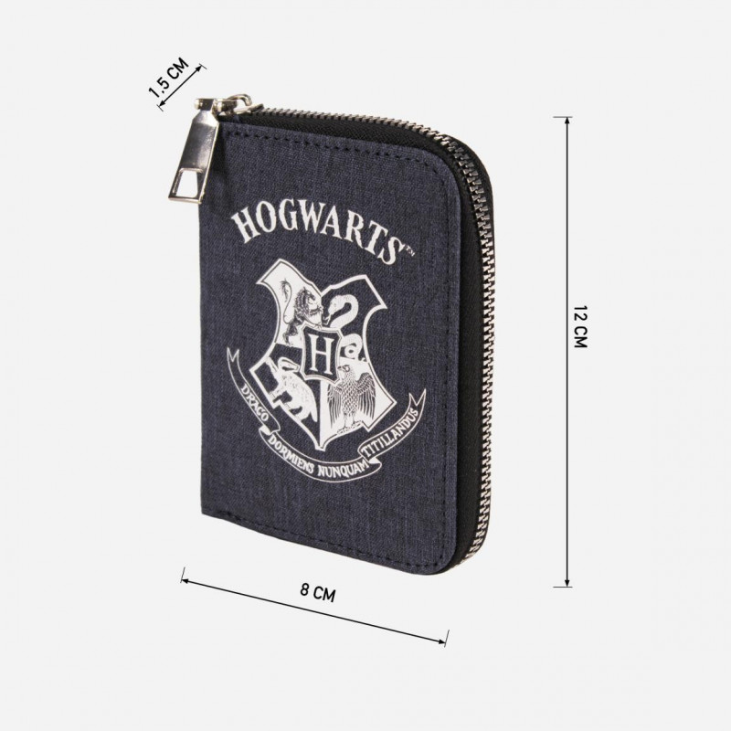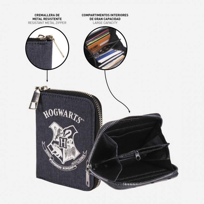 Una bonita cartera en tela vaquera para todos los fans de Harry Potter. Tiene un diseño en blanco del logo del colegio de Magia y Hechicería, Hogwarts. En su interior, tiene un montón de compartimentos y un monedero con cremallera. Mide 12x9x2cm, es una cartera muy práctica para guardar en el bolso, pantalón y utilizar a diario