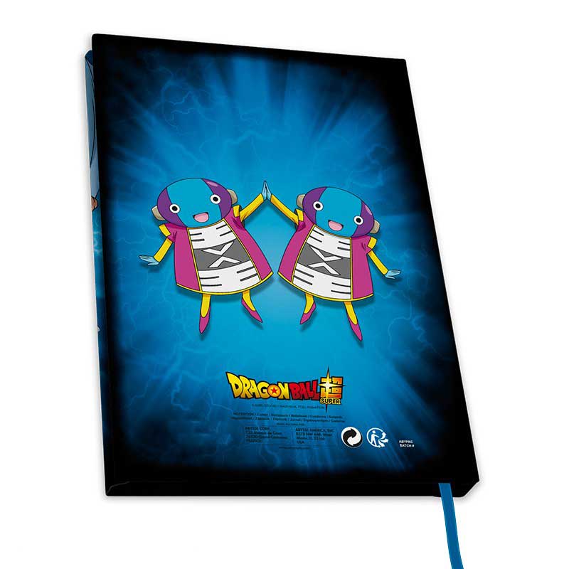 Cuaderno de tapa dura con una impresión en el frontal de los guerreros del Universo 7 y en el reverso a Zeno Sama.Tiene 180 páginas para poder escribir o dibujar tu propia aventura. Además, trae un marcador en color verde para que sepas por donde te llegas. Mide 21,7cm x 15,5cm aproximadamente. Producto con licencia oficial