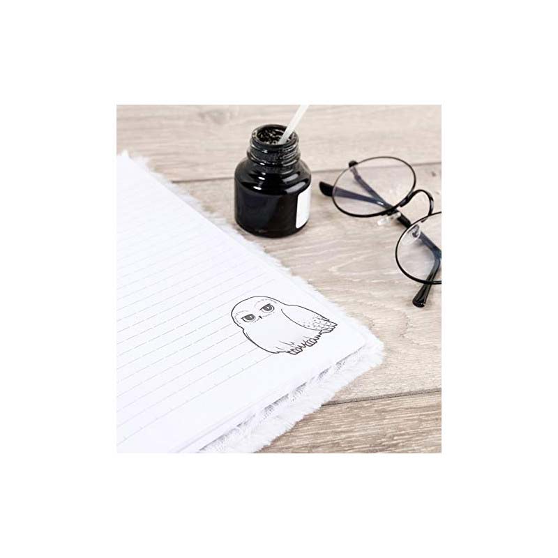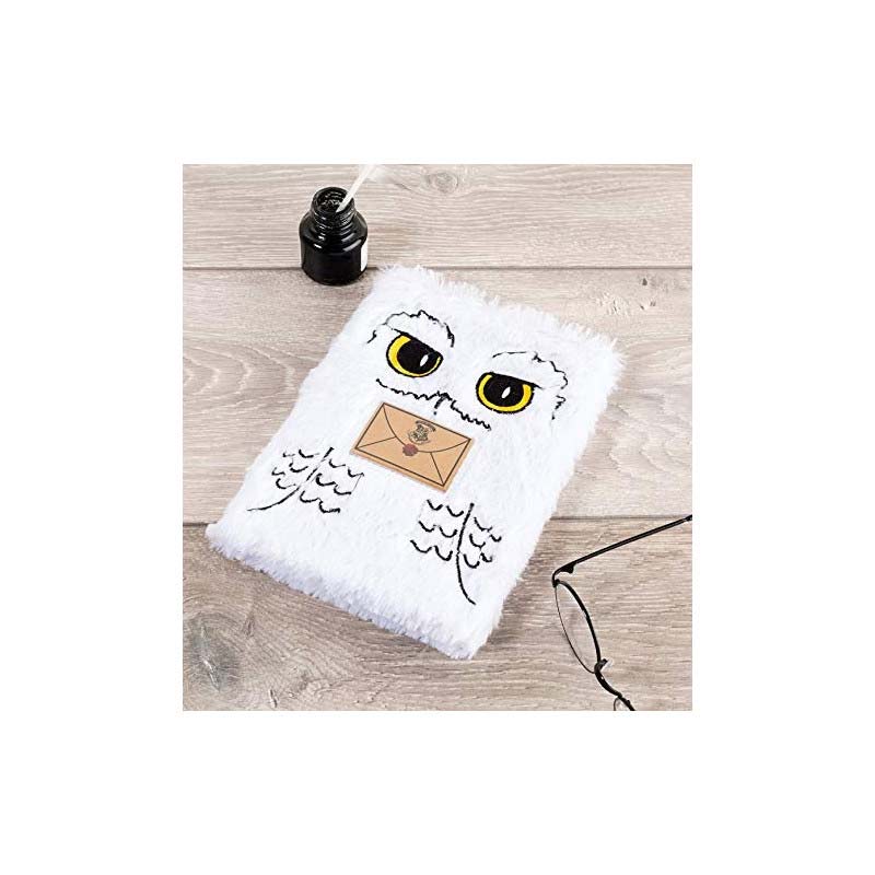 ¡Que cuaderno tan suave! Se trata de la lechuza más famosa de toda la saga, Hedwig, la fiel amiga de Harry Potter. En la portada aparece su cara con los ojos bordados en hilo en un bonito color amarillo, y lleva en el pico tu carta de admisión a Hogwarts que podrás escribir y cambiar cuando quieras