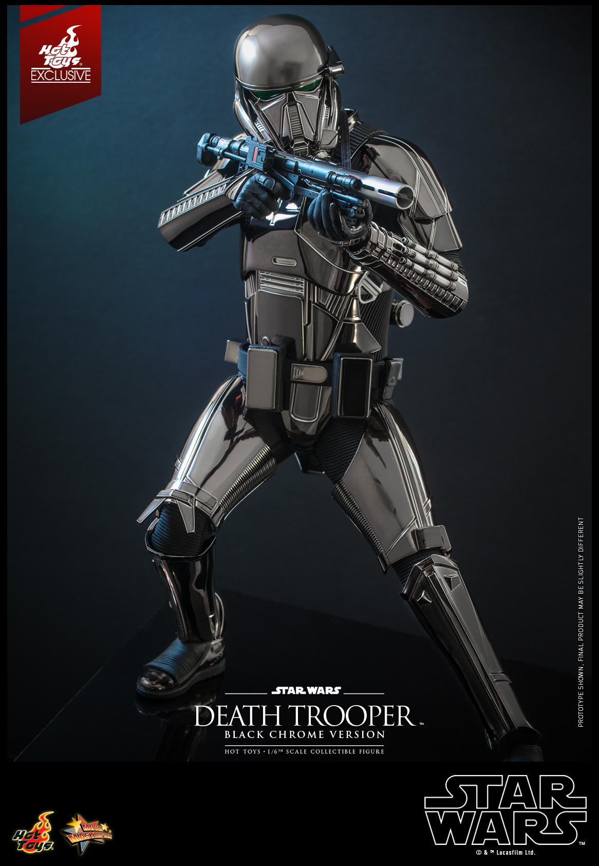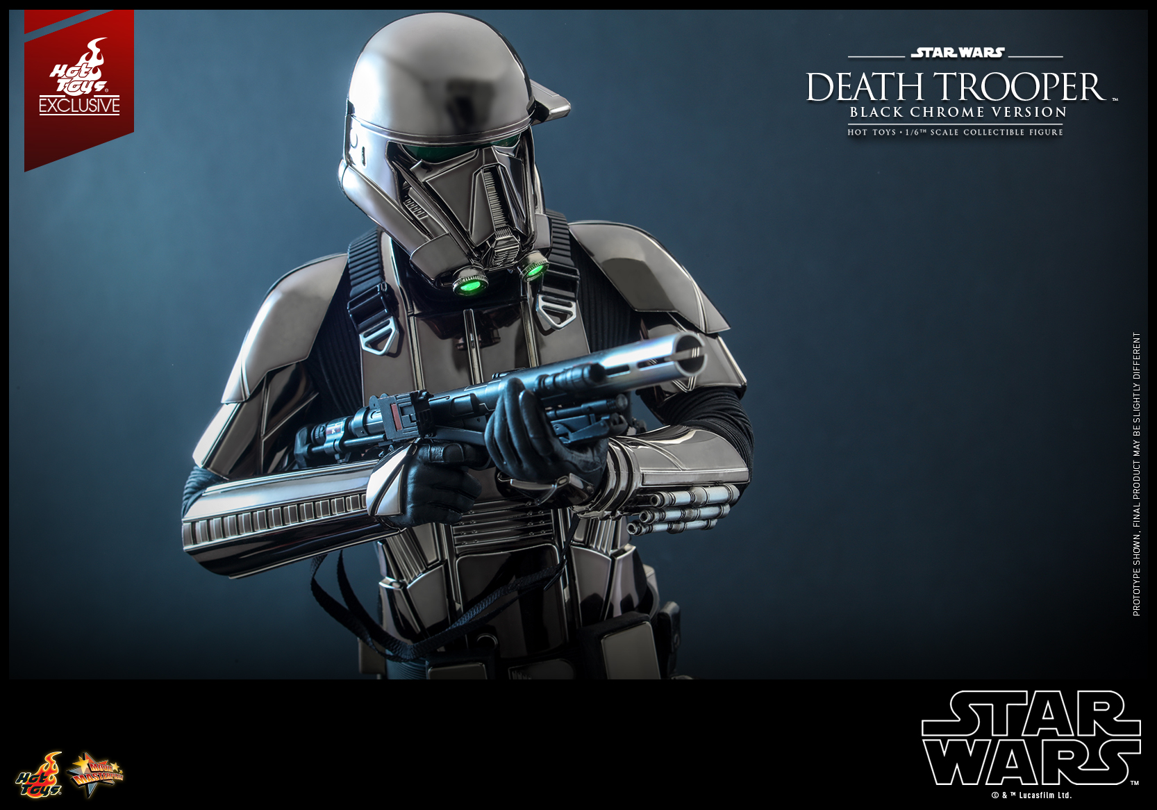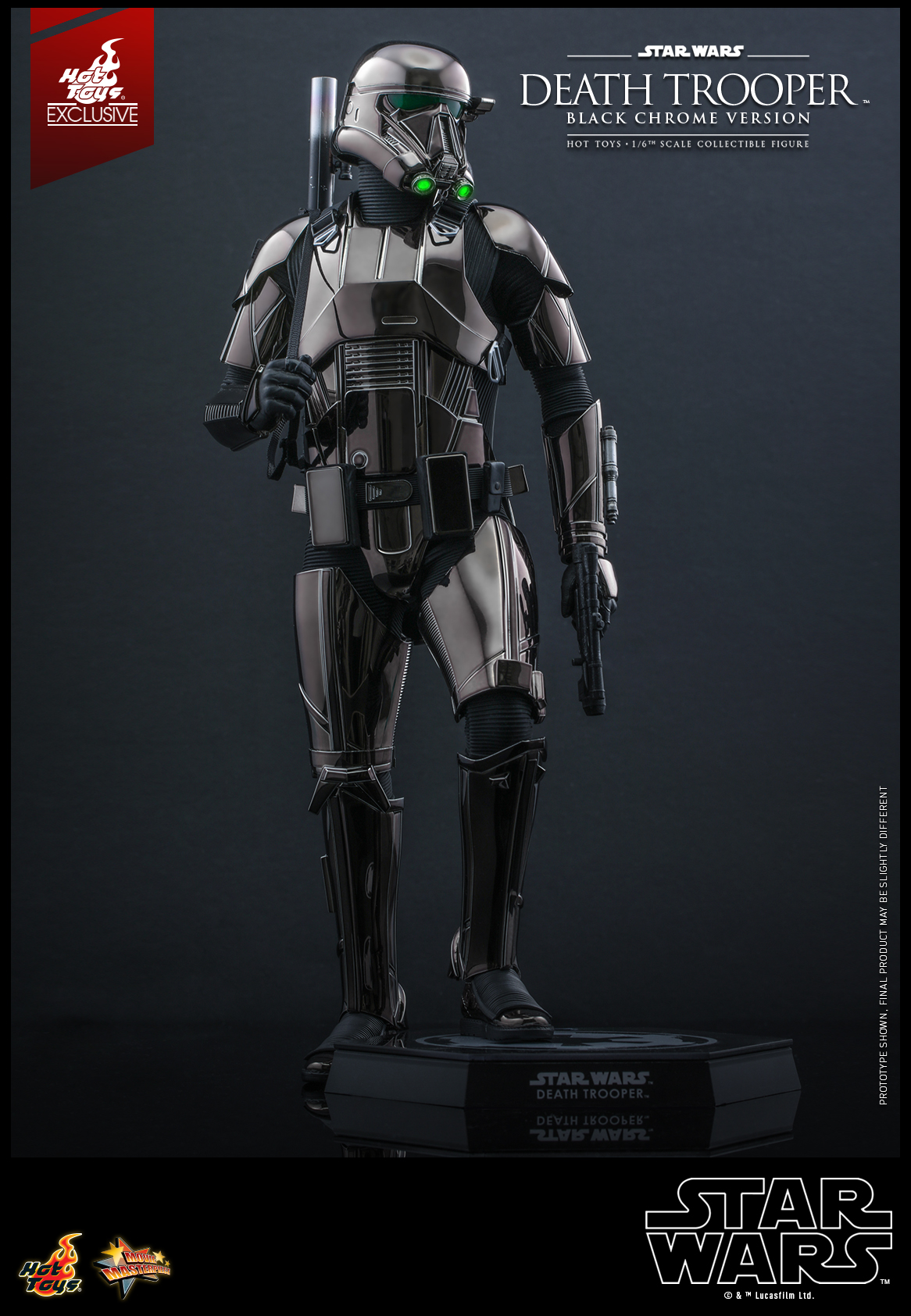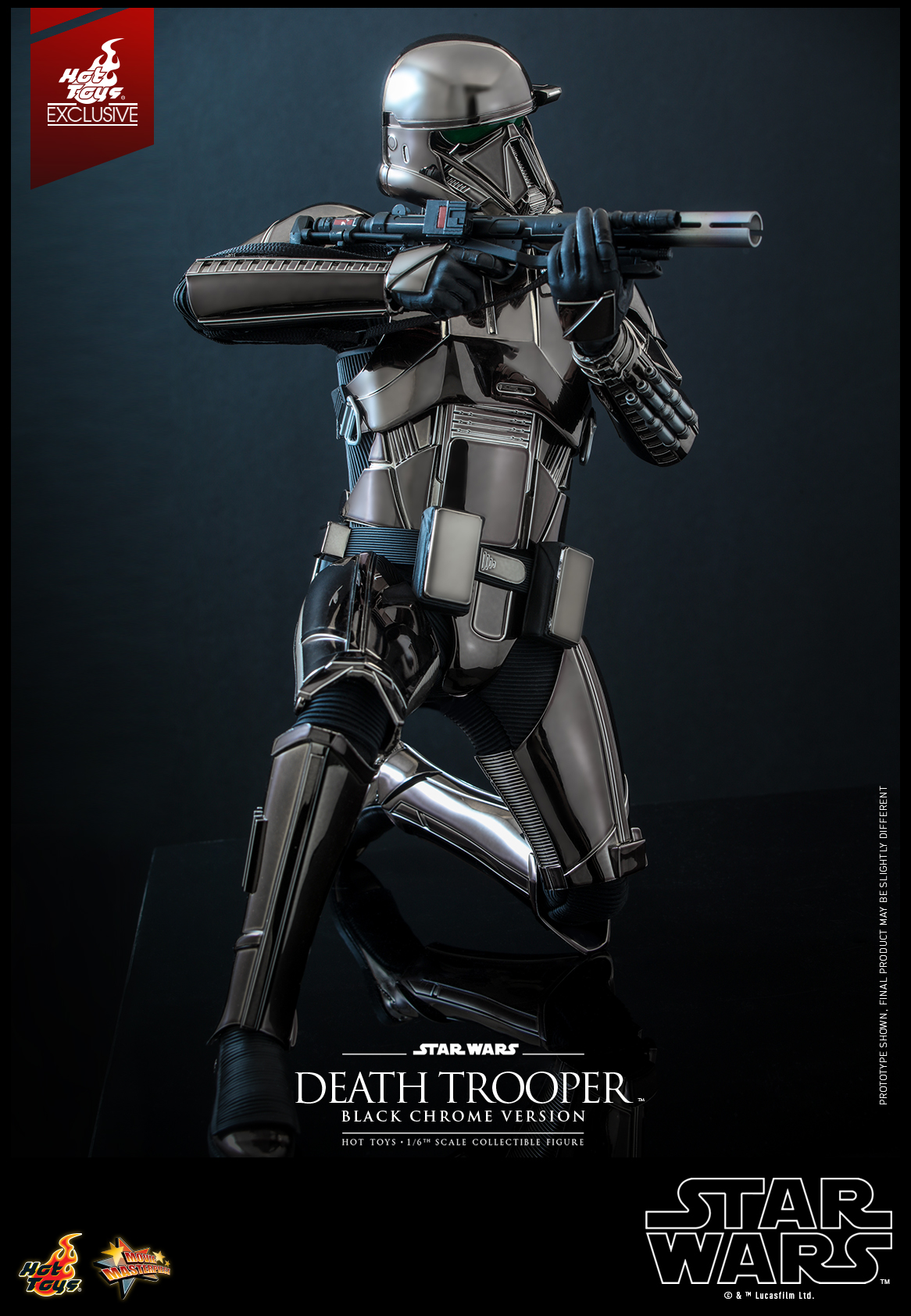 Impresionante figura figura coleccionable de Death Trooper, mide 32,5 cm de alto y presenta una armadura y un casco de cromo negro hábilmente creados con función de iluminación LED, un traje de tela, un rifle bláster y una pistola, y una base para exponer con orgullo esta majestuosa figura