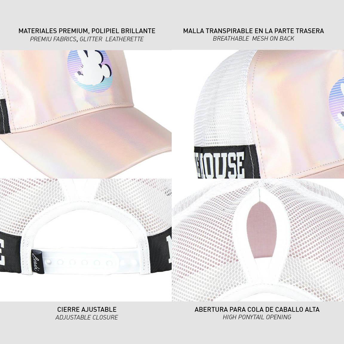 ¡Esta gorra de Minnie Mouse es preciosa mires por donde la mires!. Tiene un efecto iridiscente que refleja varios tonos según le da la luz. Además, gracias a su tejido transpirable es perfecta para el verano y tiene un hueco para la coleta alta del pelo