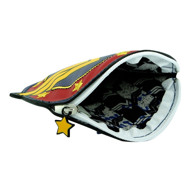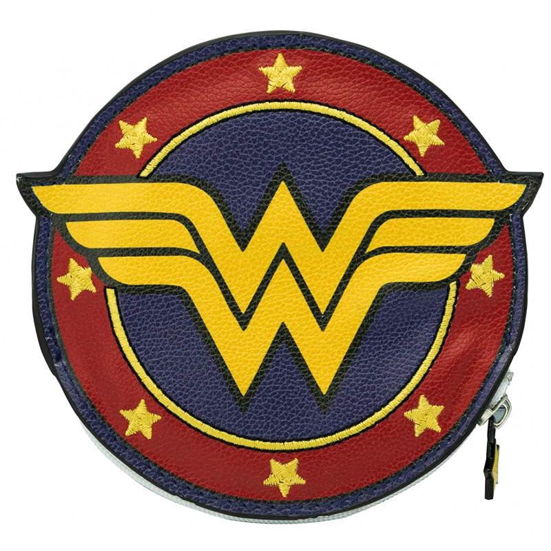 De tamaño pequeño pero muy práctico para utilizar a diario ya no tienes que preocuparte si pierdes algunas monedas o billetes, porque siempre estará Wonder Woman para protegerte. Tiene su fantástico logo y sus colores más representativos: rojo, azul y dorado (amarillo). Con una única cremallera y fabricado en cuero sintético hacen que este monedero sea único. Producto con licencia oficial