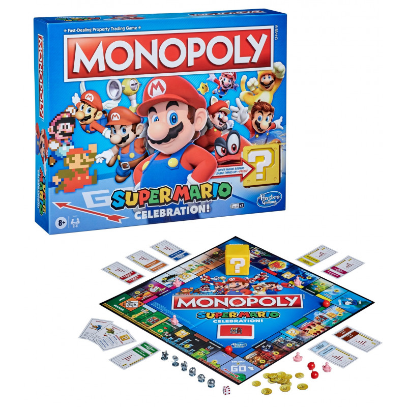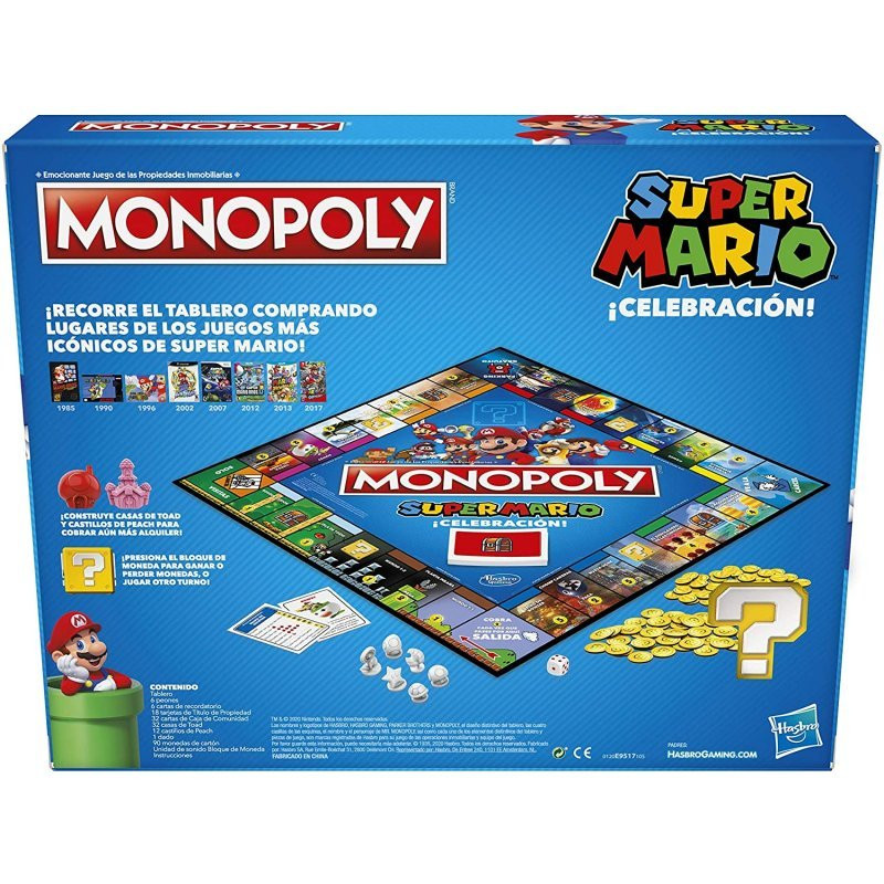 Divertidísimo monopoly de Super Mario para que pases grandes momentos de diversión con tu familia y amigos. Con esta versión "Celebración" harás un recorrido por todas las ediciones de este gran videojuego con las imágenes de las pantallas más conocidas. Además, podrás elegir como jugador a Mario, la princesa Peach, Yoshi o Donkey Kong