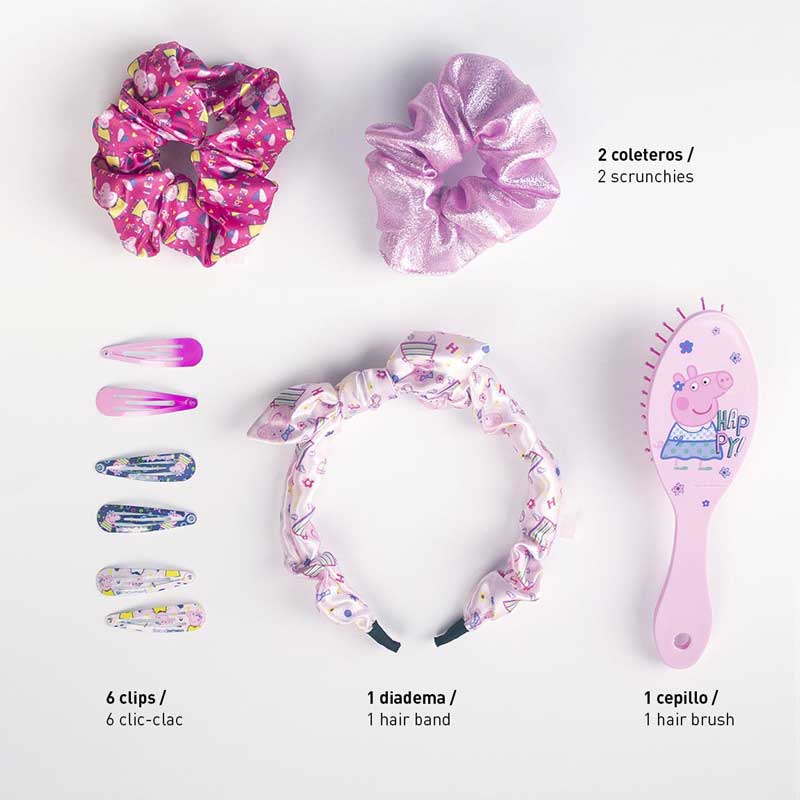 Si estás buscando un regalo de Peppa Pig, con este precioso neceser acertarás seguro. Tiene 9 accesorios distintos para el pelo.