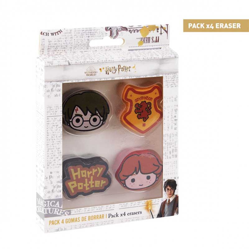 Un súper detalle para regalar a un gran fan de Harry Potter. Se trata de 4 gomas distintas de Harry, Ron, el escudo de Gryffindor y el logo de esta gran saga. Licencia oficial