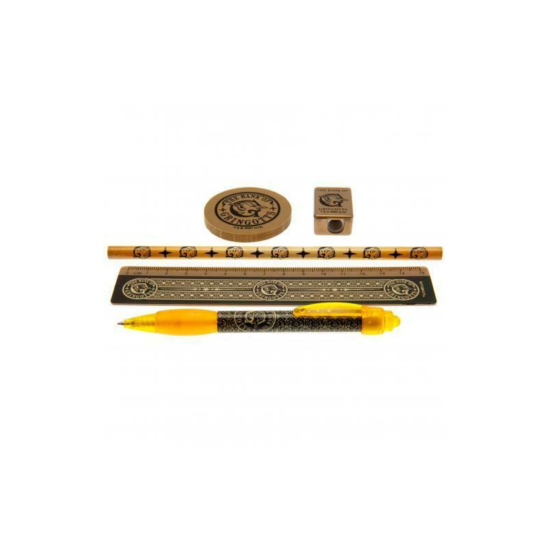 Regalo perfecto para todos los fans de Harry Potter inspirado en el banco de Gringotts. Además, vien en un estuche transparente muy chulo. Incluye: lápiz, bolígrafo, sacapuntas, goma de borrar y regla de 15cm