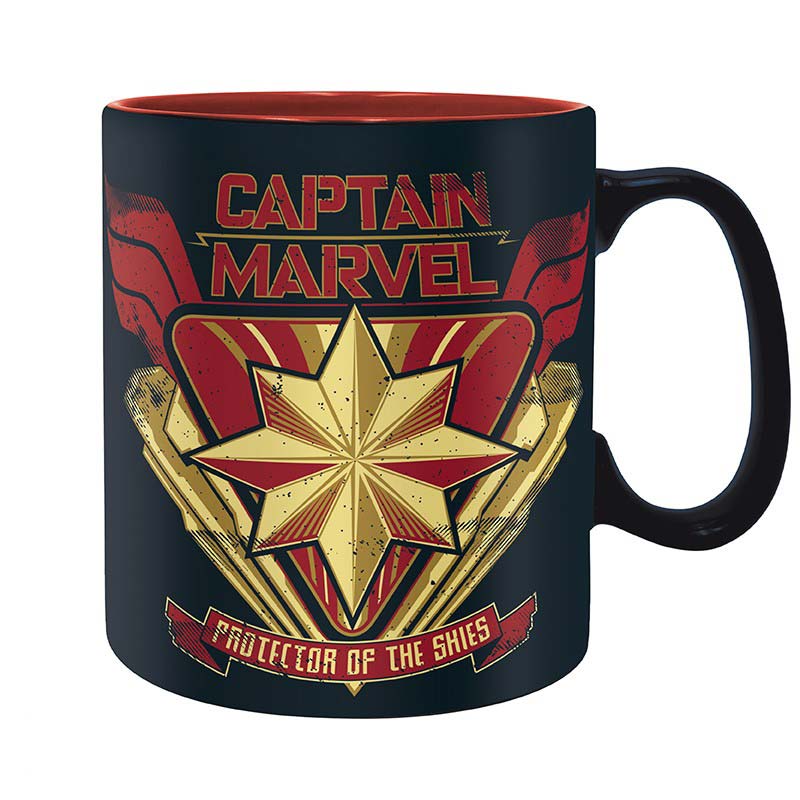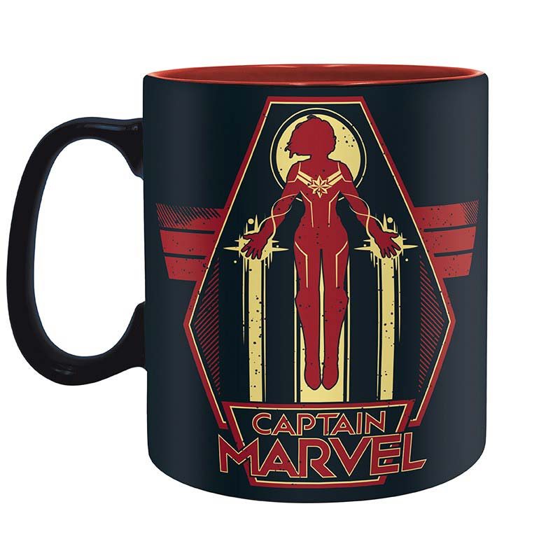 Taza de una de las superheroínas más espectaculares de Marvel, la Capitana Marvel. Su diseño es espectacular, por un lado tiene su silueta y por el otro, su logo
