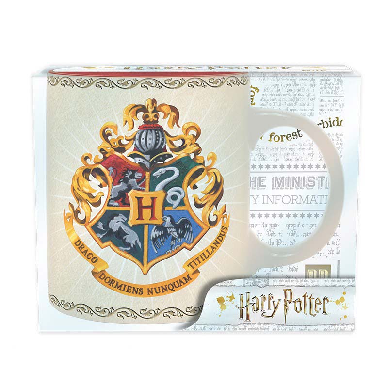 ¡Una maravilla de taza!. Fabricada en cerámica con impresión de alta calidad, tiene un elegante diseño del increíble escudo de Hogwarts y por el otro lado, aparecen las cuatro casas ¿A cuál perteneces tú?. Apta para el lavavajillas y el microondas