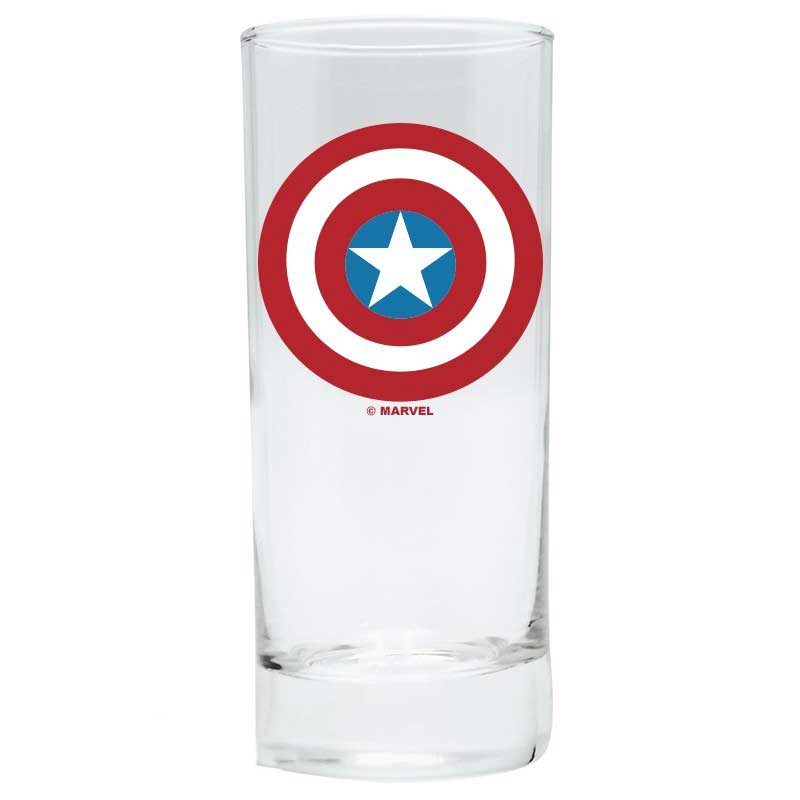 Un elegante vaso de vidirio de alta calidad con el escudo del Capitán América. Un regalo excepcional para todos los fans de Marvel o del Capitán América