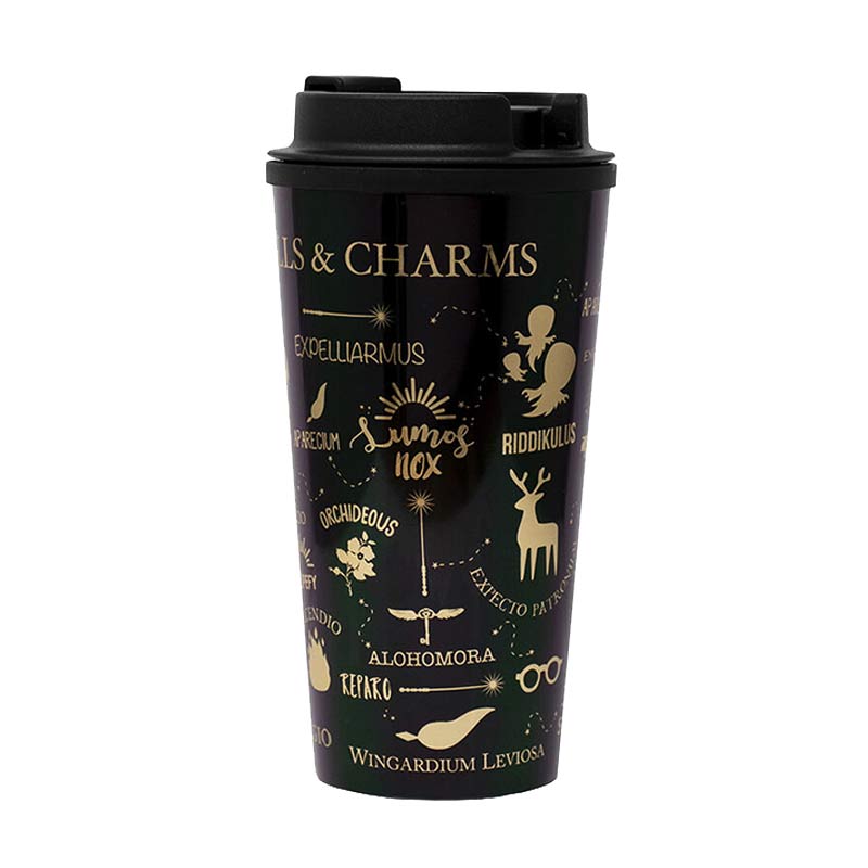 Lleva todos los hechizos y encantos más conocidos de magia contigo, nunca se sabe cuándo pueden hacerte falta. Este vaso de viaje tiene un elegante diseño de los elementos más importantes de Harry Potter en negro y dorado brillante que lo hacen único. Gracias su ranura evita que la bebida se derrame. Capacidad 350ml aproximadamente. Licencia oficial