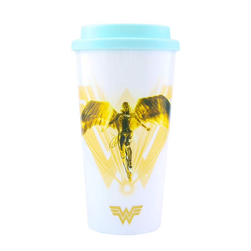 Siéntete como la super heroina Wonder Woman cada vez que bebas de este vaso de viaje. Tiene un diseño espectacular de la película Wonder Woman 1984 donde aparece con su armadura dorada